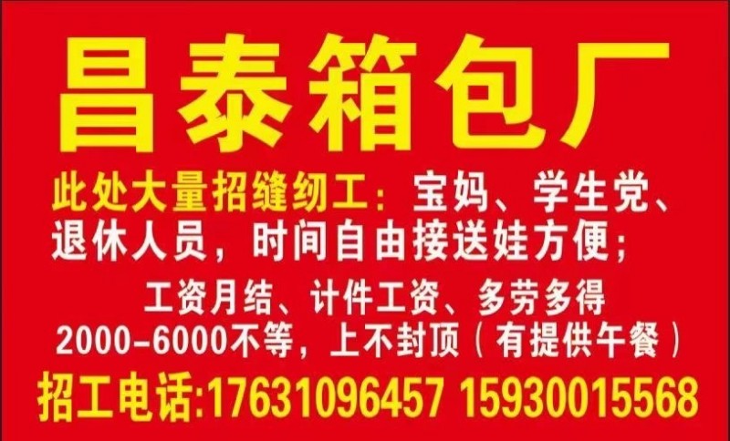 昌泰箱包加工厂招聘缝纫工,常年有活,简单易学好上手,不耽误接送孩子,时间自由,中午管饭