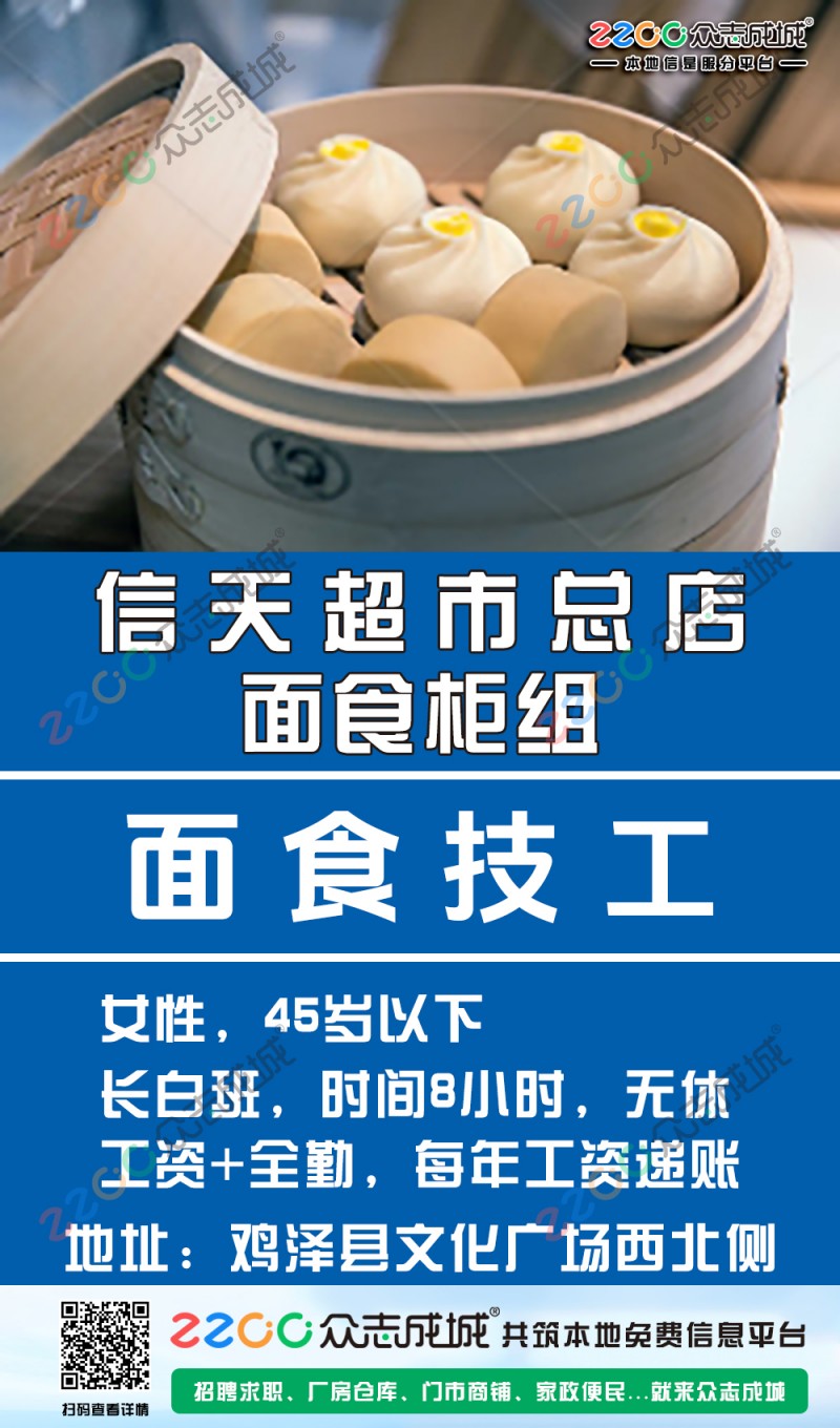 信天超市面食柜组,招聘包饺子工,烤饼工3名,工资面议。早晚班,实习期3天。要求55岁以下,有责任心。适应能力强。服从公司规章制度。鸽子勿扰!!!微同。