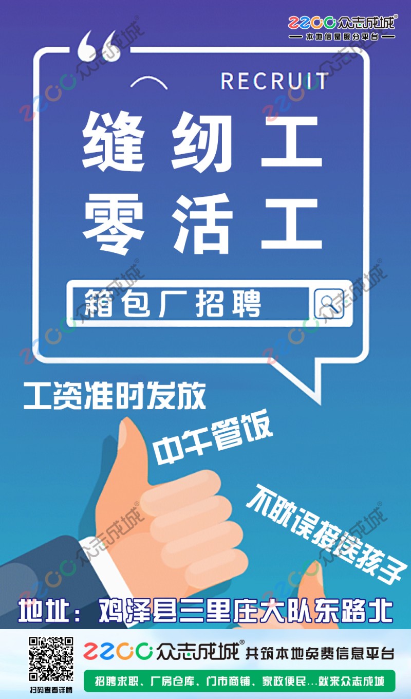 箱包厂招聘:缝纫工,时间自由,中午管饭