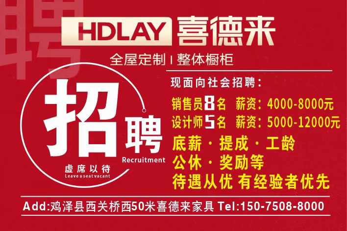 喜德来家具招聘:设计师5名,工资4000-16000元,薪资待遇:底薪+提成+公休+奖励等,待遇从优,有经验者优先