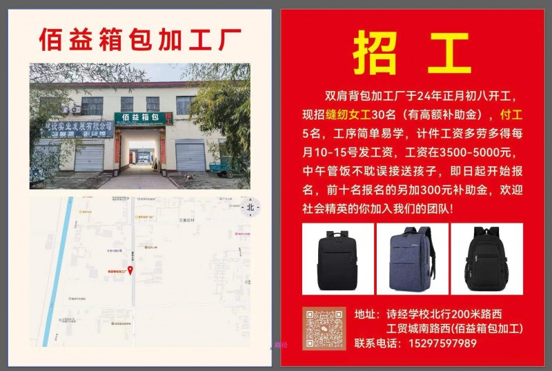 双肩背加工厂招熟练缝纫机工10名,反包工2名,工序简单易学,计件工资,多劳多得,中午管饭,不耽误接送孩子。