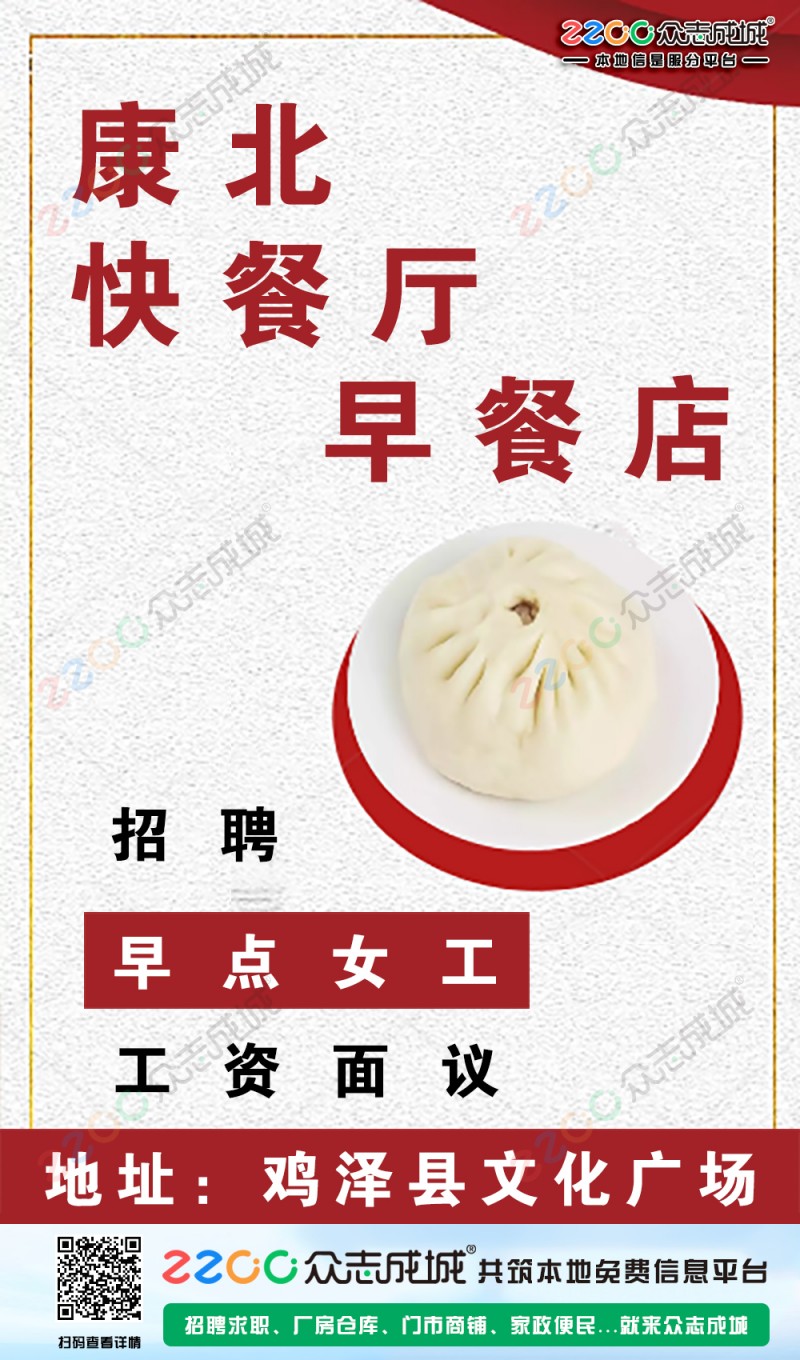康北快餐厅早餐店招聘:早点女工2名,工资面议,地址:鸡泽县文化广场