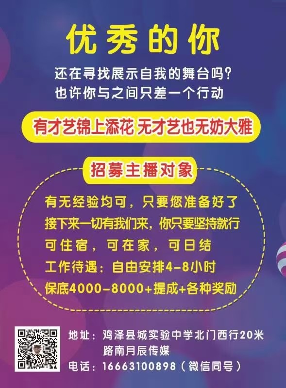 招聘:主播 招聘:主播,年龄18周岁以上,男女不限,学历不限,有无经验均可,没有任何要求,来了直接上班,工资3000-6000元