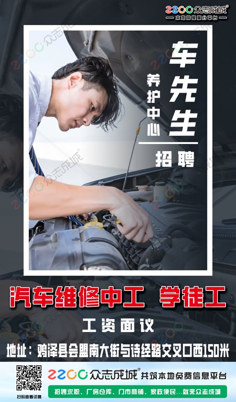 车先生养护中心招聘:汽车维修中工一名,学徒两名,有意者可致电联系,工资面议