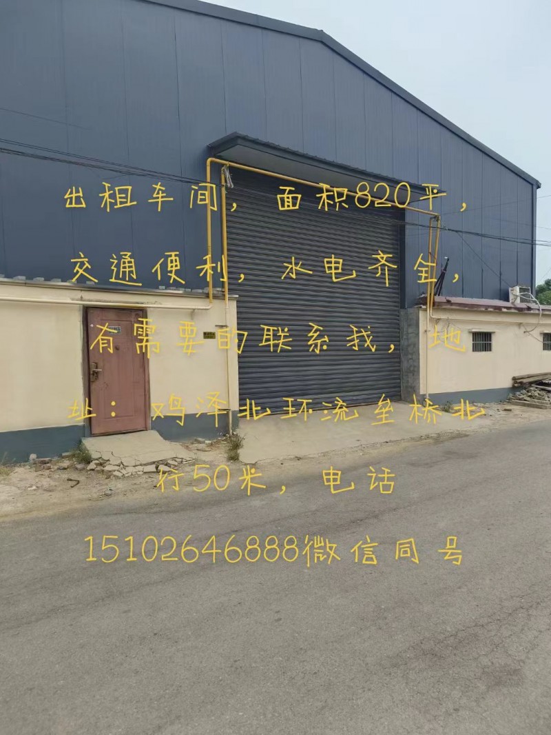 出租车间,面积820平,交通便利,水电齐全,地址:鸡泽县北环路流垒桥北行50米。