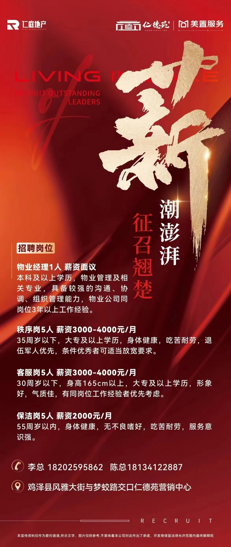 仁庭地产德仁德苑美置服务招聘:客服岗2名,薪资3000-4000元/月,30周岁以下,身高165cm以上,大专及以上学历,形象好,气质佳,