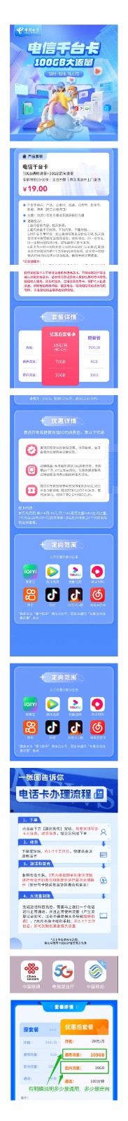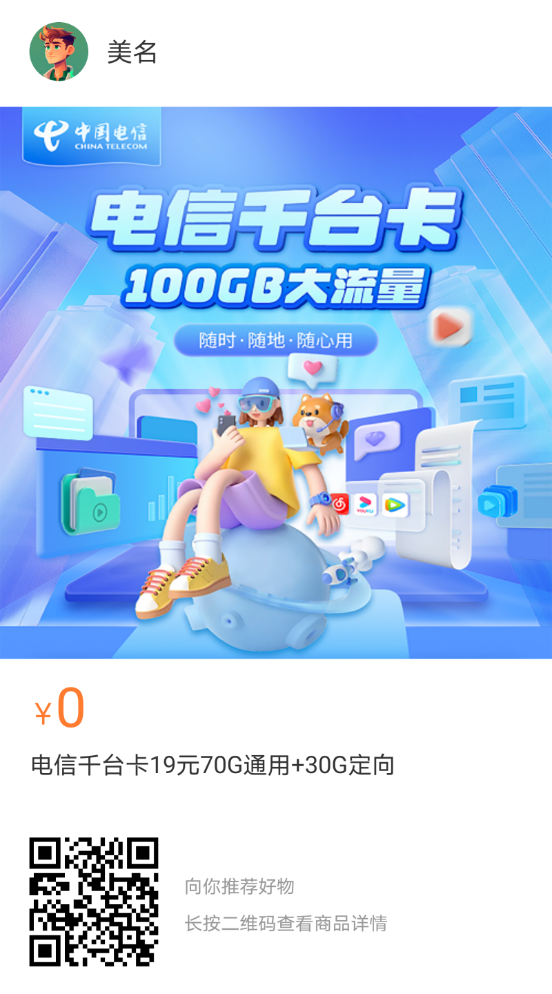 【电信千台卡】19元/月185G流量(70G通用+激活再赠送85G通用+30G定向)+0.1元/分钟,无合约期!((激活再赠送的85G流量需按要求完成首充还有联通移动电信可供选择,可加微信咨询