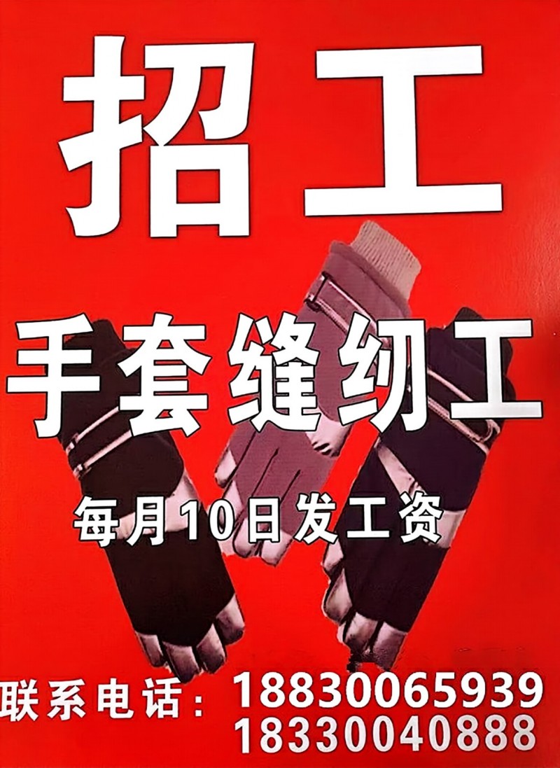 长期招聘手套缝纫工,中午管饭,不耽误接孩子,时间自由,工资月结,常年有活