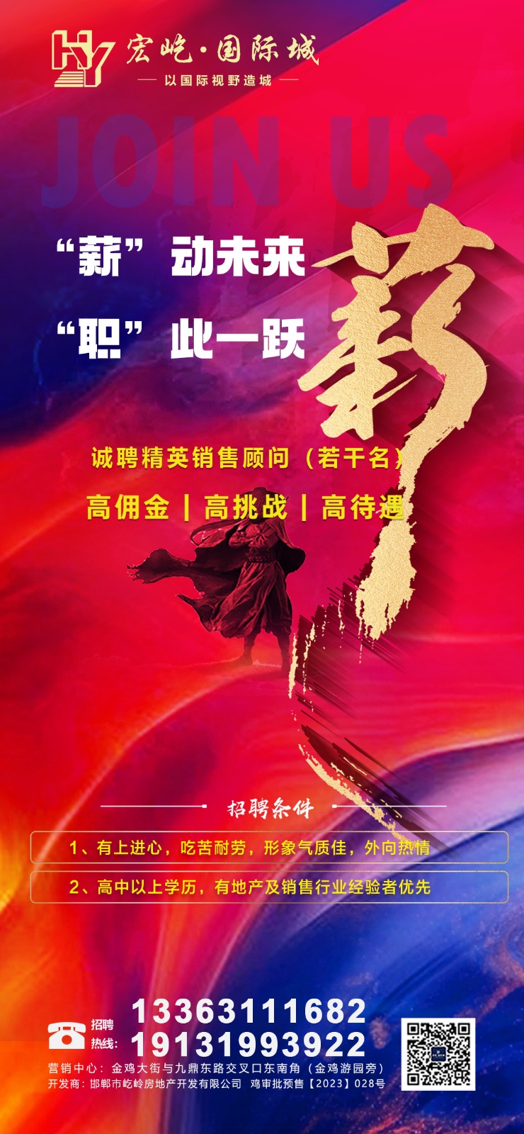 宏屹国际城,高端成熟楼盘,现高薪诚聘:置业顾问若干名,要求有上进心,吃苦耐劳,形象气质佳,待遇丰厚,择优录取。贷款专员有经验者优先