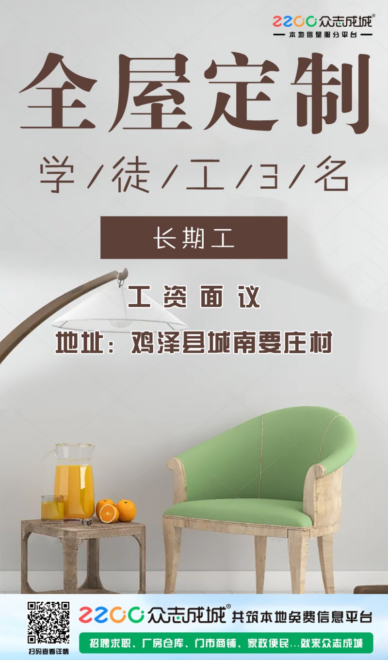 全屋定制招聘:学徒工3名,要求长期工,工资2000-5000元,地址:鸡泽县小寨镇要庄村