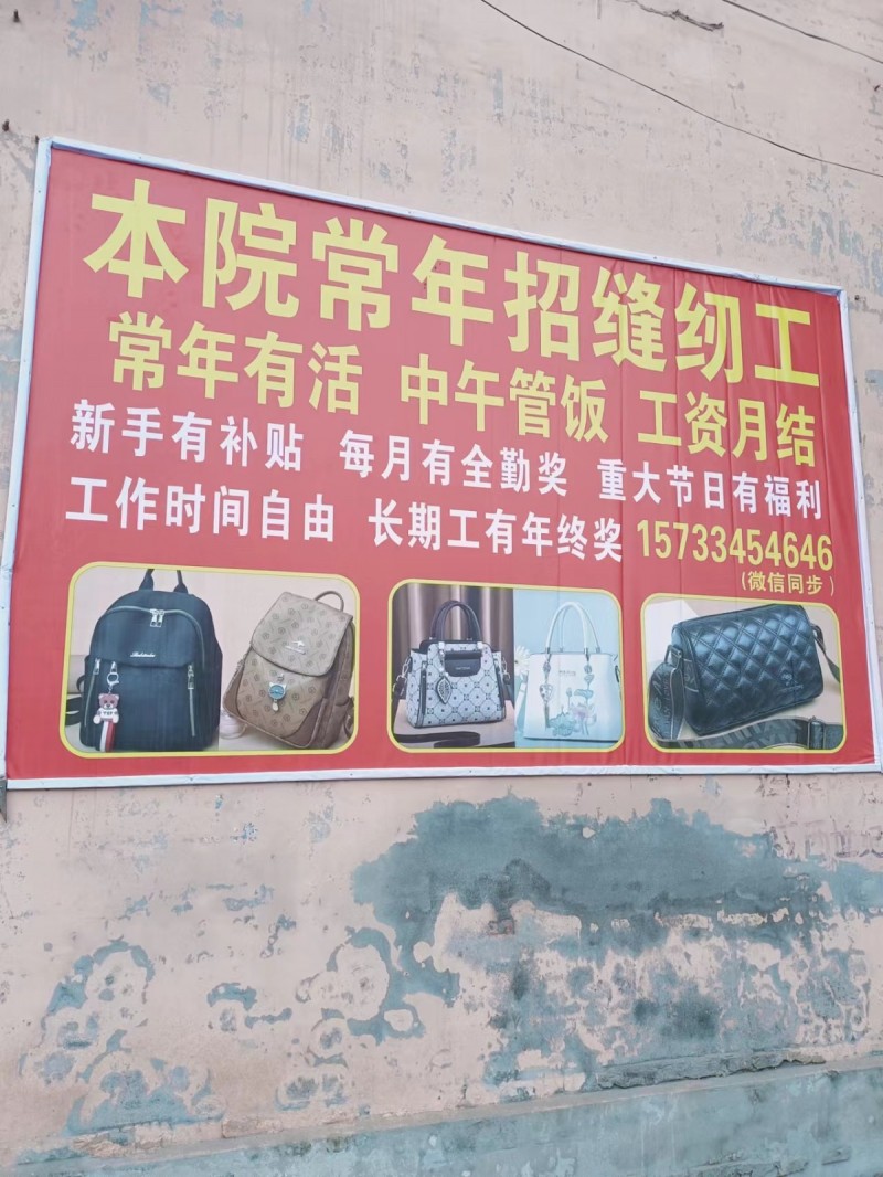 王庄女包工厂(正月初六开工)招聘:缝纫机熟练工,工资面议,常年不换活儿不断料,有意向找工作换工作的可以来看看,地址:鸡泽县王庄村