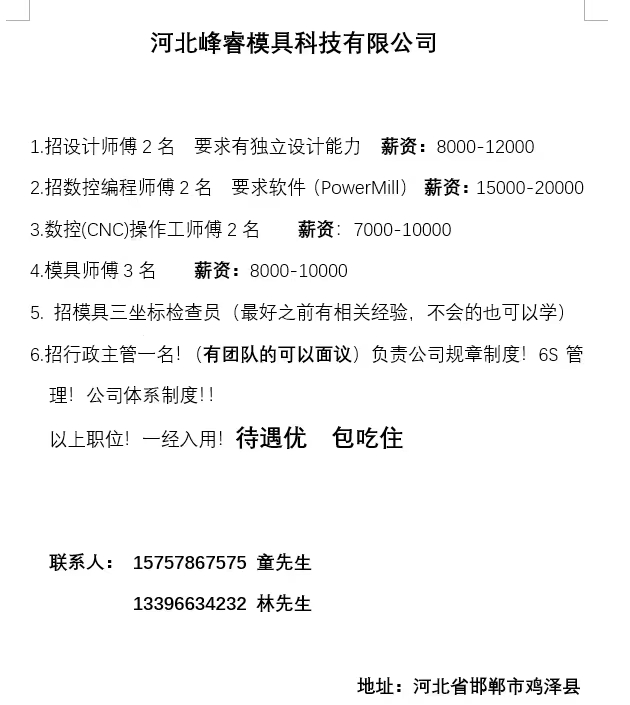 河北峰睿模具科技有限公司招聘:数控编程师傅2名,要求软件(PowerMi),薪资15000-20000元。数控(CNC)操作工师傅2名,薪资7000-10