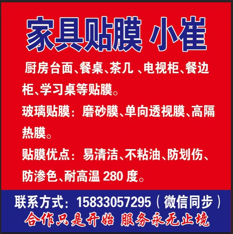 厨房台面、餐桌、茶几、电视柜、餐边柜、学习桌等贴膜。玻璃贴膜:磨砂膜、单向透视膜、高隔热膜。贴膜优点:易清洁、不粘油、防划伤、防渗色、耐高温 280 度