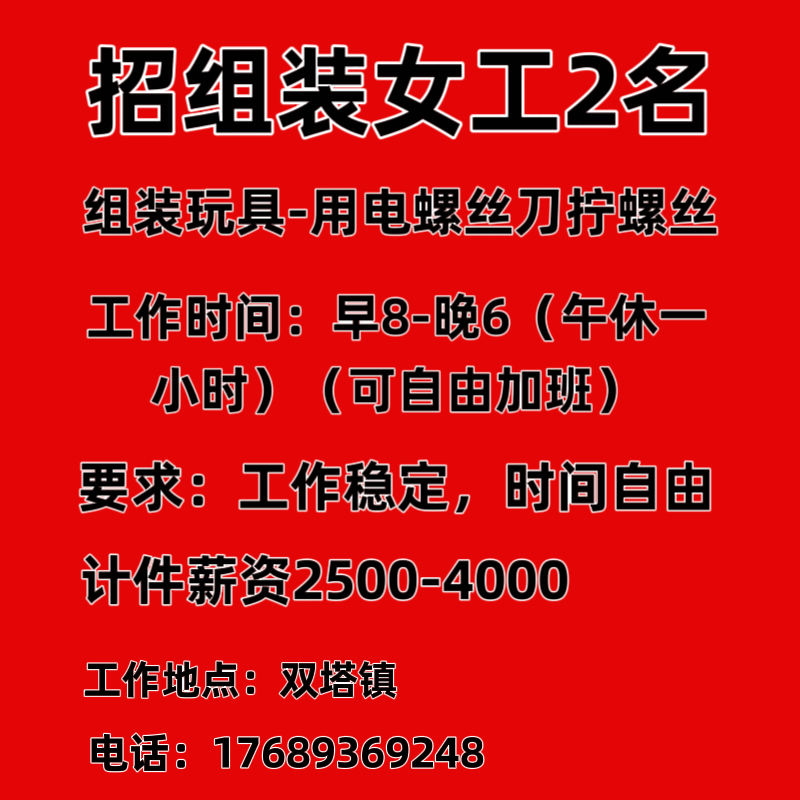 招聘组装女工,组装玩具拧螺丝(使用电螺丝刀)不会可学眼睛不花手快就能干薪资面议-计件工资2500-4000地点:鸡泽县双塔镇直接电话联系!