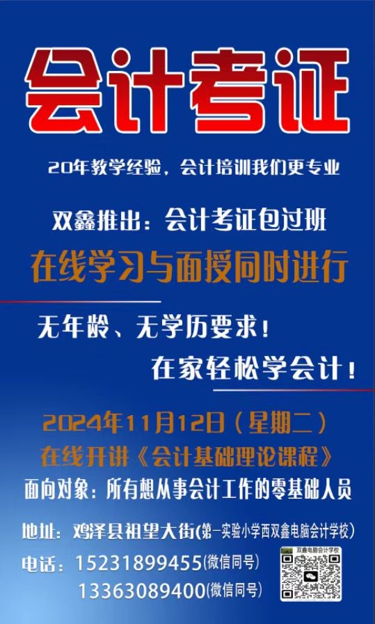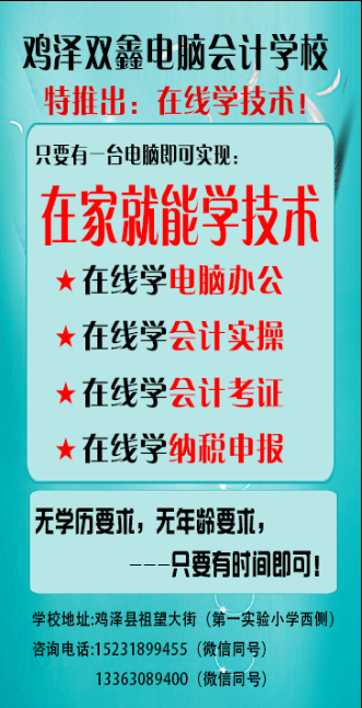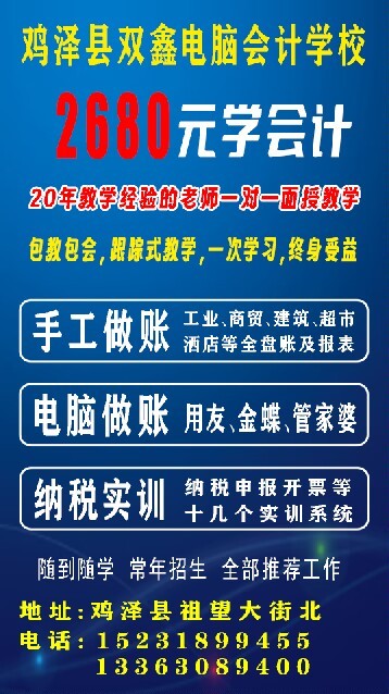 鸡泽县双鑫电脑会计学校线上线下招生中、开设课程、会计考证班、会计实操班、会计就业班、办公自动化班、平面设计班、地址祖望大街与第一实验小学交叉路口向北200米路西外贸小区路口、歌乐山大酒店往南100米路西
