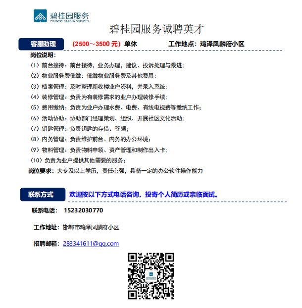 鸡泽风麟府碧桂园物业招聘:物业前台客服,要求女,25-35 周岁,大专及以上学历,责任心强,具备一定的办公软件操作能力,2500-3500元,单休,转正五险一金