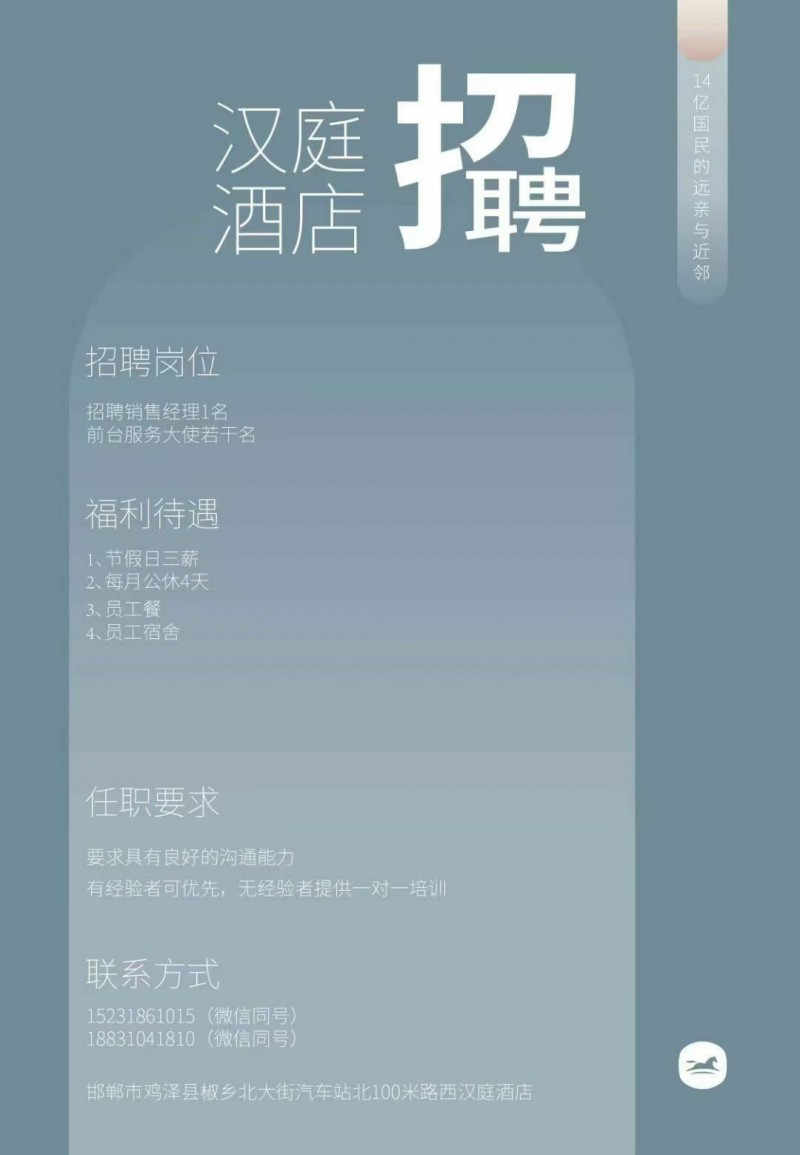 汉庭邯郸鸡泽汽车站酒店招聘:客房保洁人员若干名,节假日三薪,每月公休4天,要求具有良好的沟通能力,有一定的抗压能力,有经