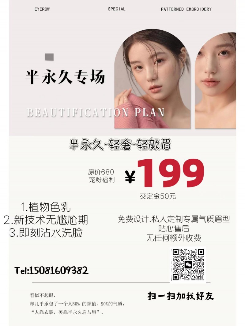 新年宠粉福利[烟花] 转发朋友圈➕1️⃣9️⃣9️⃣,即刻做原价680元轻氧雾眉[玫瑰] ➕积攒30个,免费送[礼物]滑板车,乳胶枕,保温杯(三选一) ➕朋友圈预留一个月,免费补色一次 活动时间:2024.12.7—2024.12.20(定金预留为准,免费设计眉型,不满意包退)[庆祝] 新娘跟妆,订婚妆,婆婆妆,生活妆,全部8折 地址:鸡泽县国土局生活小区