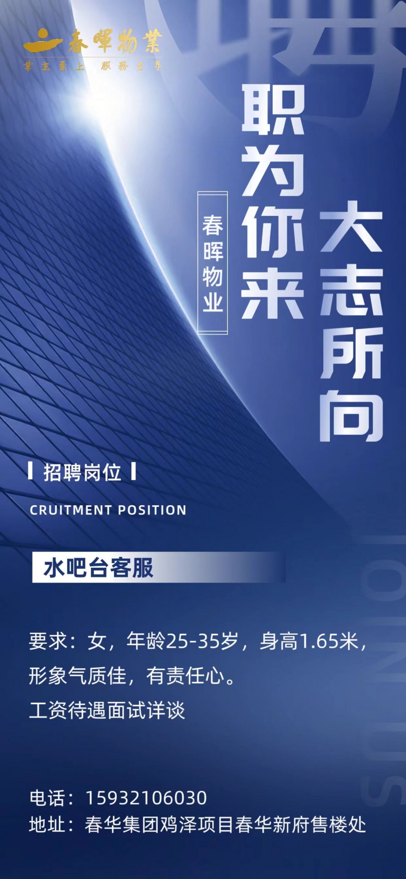 春晖物业高薪招聘:水吧台客服,要求女,年龄25-35岁,身高165,形象气质佳,工资面议