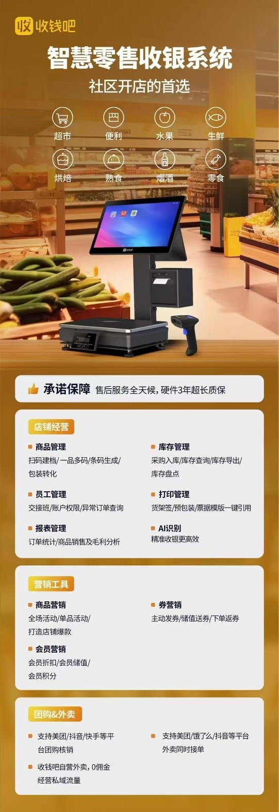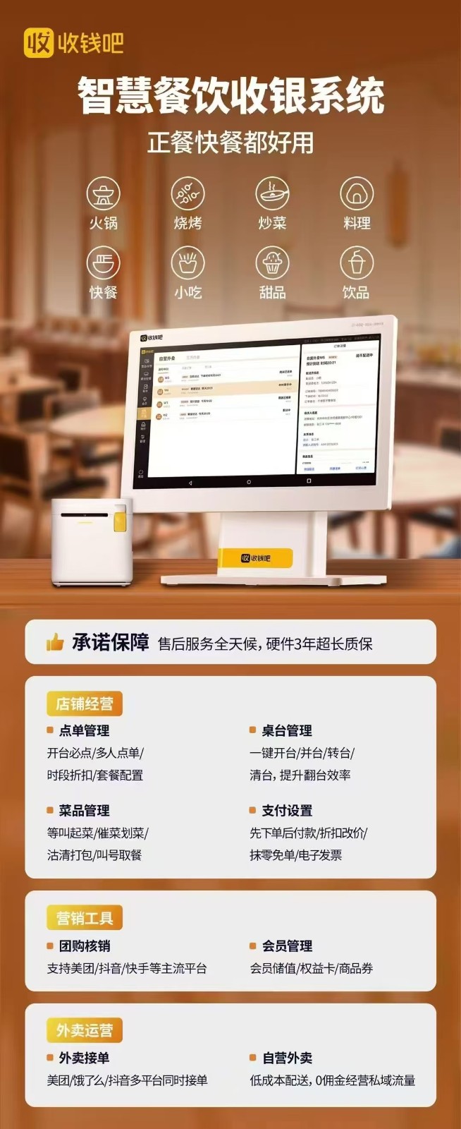 收钱吧/富掌柜收银机收银系统 手机app点餐收银机点餐 扫码点餐会员充值 对接外卖接单和团购核销 提供一站式服务:上门安装、收银培训及终身售后