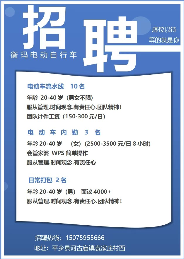 招聘:电动车正装10名 日工3名 干到年底的也可以 年龄30-40岁 (男女不限常年有活) 河古庙袁家庄