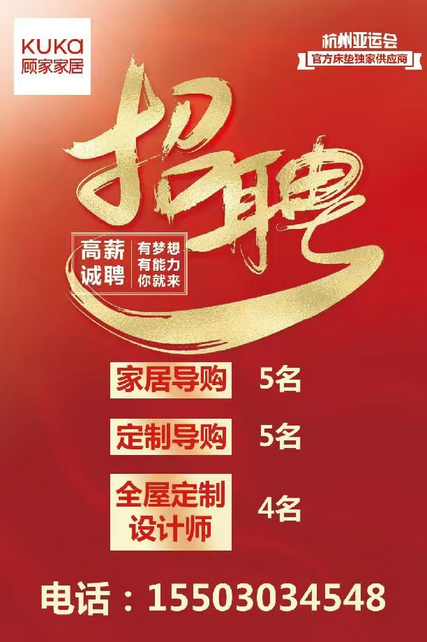 鸡泽顾家家居高薪诚聘:家居导购5名,定制导购5名,底薪+提成+奖金+福利