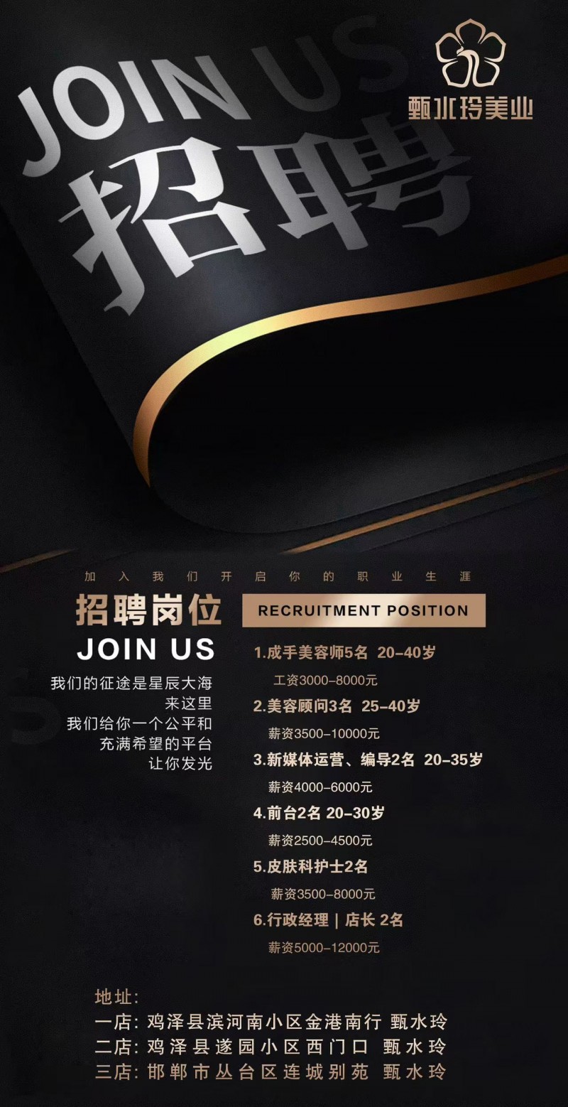 甄水玲美业招聘:前台2名,20-30岁,薪资2500-4500元,工作地址:一店地址:鸡泽县滨河南小区金港南行甄水玲,二店地址:鸡泽县遂园