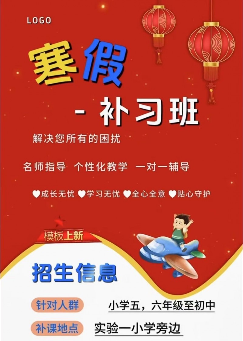 寒假补习班开始招生啦!1月15号开始上课 一线教师授课,学生招够为止,连续办班三年,经验丰富 补习科目:语文,数学,英语,物理,化学 招生对象:五,六年级,初一初二,初三, 上课地点:实验一小学旁边 联系方式: