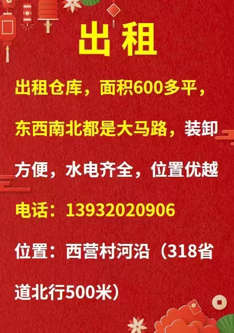 出租仓库面积600多平,东西南北都是大马路装卸方便,水电齐全,位置优越。位置;西营村河沿(318省道北行500米)