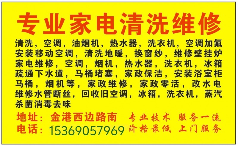 专业家电清洗维修:空调.烟机.热水器.洗衣机.安装移动空调.空调加氟.清洗地暖.清拆清洗.疏通下水道.马桶堵塞,家电维修:空调,烟机,热水器,洗衣机,冰箱,家政维修:各种家具门窗,家政保洁,换窗纱,家政零活,安装浴室柜马桶烟机等,改水电,维修水管断丝,高价回收旧空调,旧冰箱旧冰柜旧洗衣机,维修天然气灶,全拆清洗,蒸汽杀菌消毒去味,专业技术,服务一流,价格最低,上门服务。