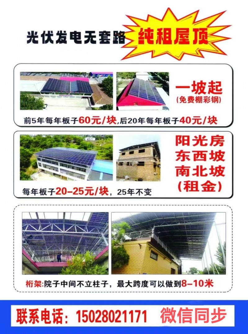 免费✔免费✔免费 安装光伏 利用闲置房屋,房顶,院落,闲置宅基地,可施工单坡,人字坡,阳光房,厂房,可滴水不漏,保护房顶,延长房屋寿命, 老百姓不花一分钱,每年还可挣租金, 每个村庄名额有限,租金可观, 各地区各乡镇各村庄,都可安装 报名电话: 微信同步
