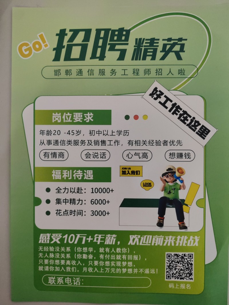招聘职位:客服移动官方客服鸡泽【中国移动】高薪招聘:联通官方客服人员20名,要求:年龄在25-50岁,男女都可,待遇:底薪2000+