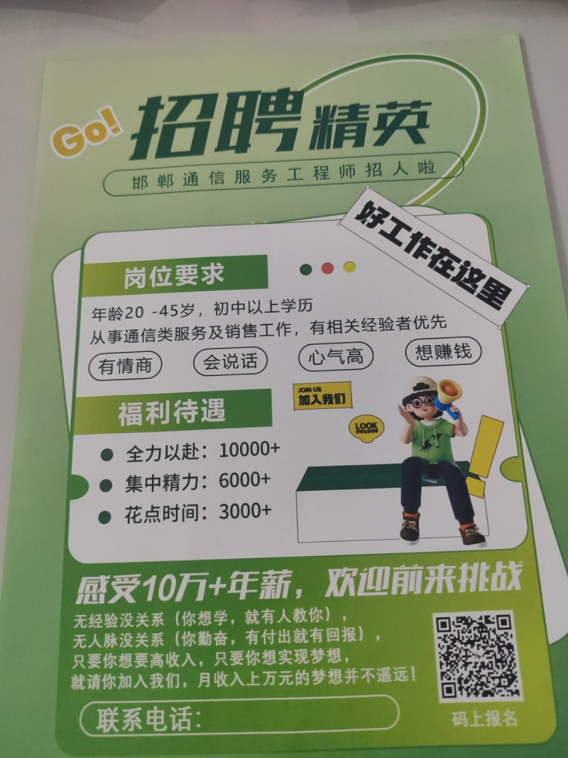 招聘职位:客服移动官方客服 鸡泽【中国移动】高薪招聘:联通官方客服人员20名,要求:年龄在25-50岁,男女都可,待遇:底薪2000+佣金+奖金,月均综合工资4000元-1万元,上不封顶,工作时间:时间自由