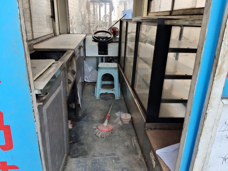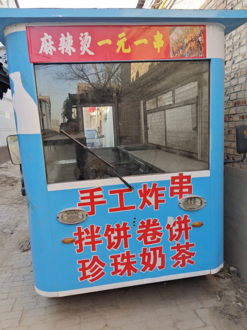 出售电动四轮餐车,长:3米,宽1.6米,内有2米冷藏柜。中间是走廊,两边是平台。