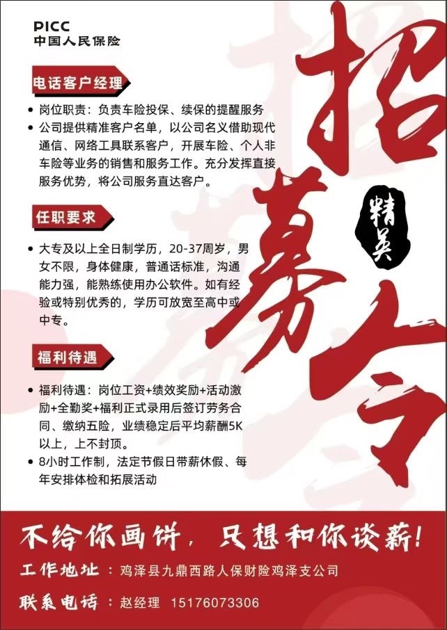 中国人保财险鸡泽支公司招聘:电话客户经理,福利待遇:岗位工资+绩效奖励+活动激励+全勤奖+其他福利,正式录用后签订劳务合同,缴纳五险,你有梦想,我有舞台,带上你的简历,快来加入吧