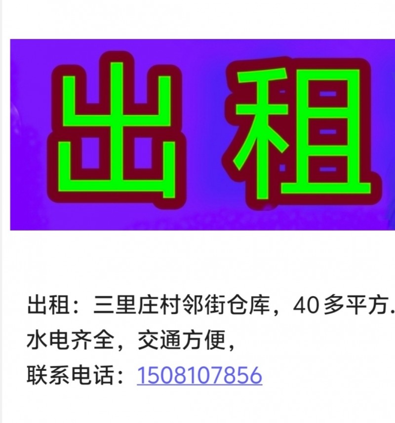 出租:三里庄村临街仓库,40多平方,水电齐全,交通方便。