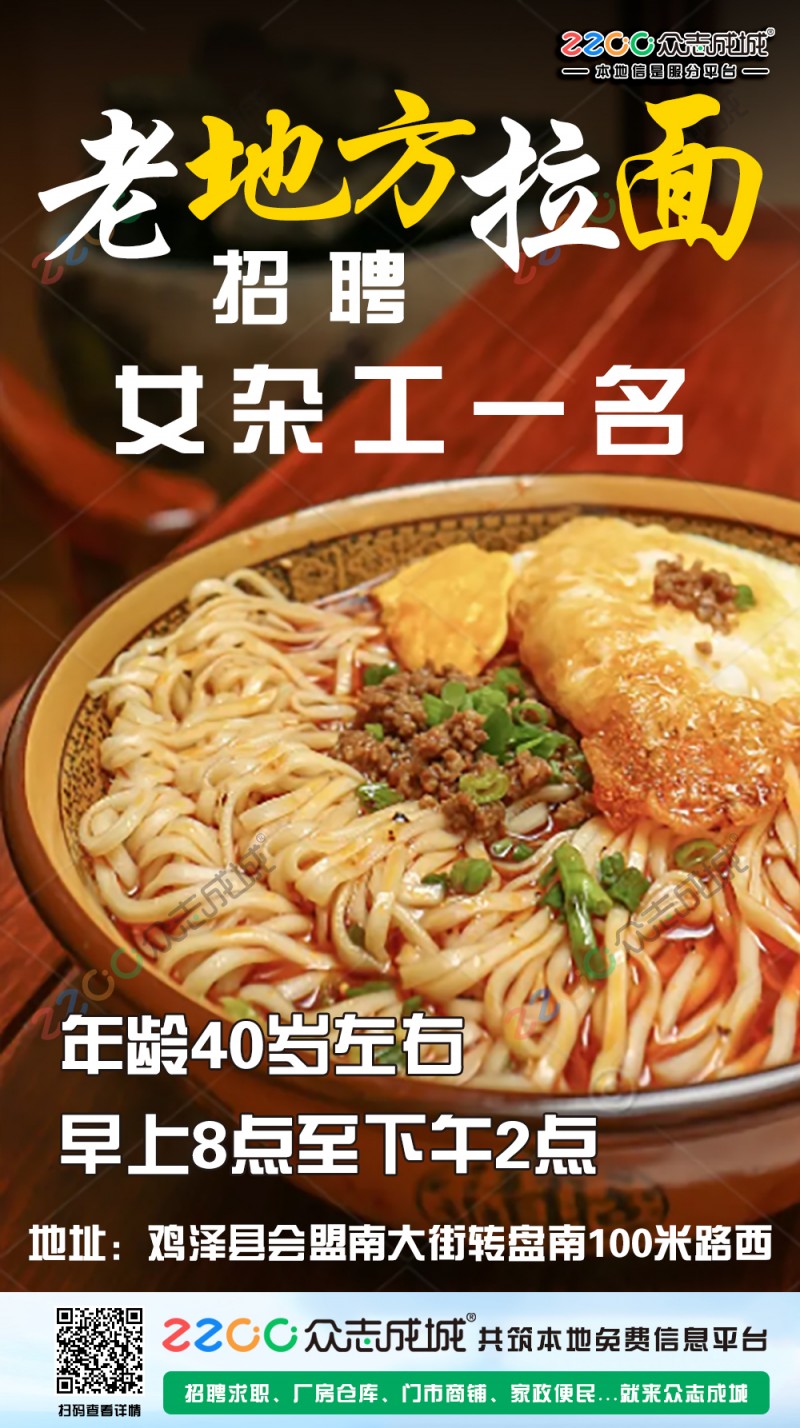 老地方拉面馆招聘:长期女杂工一名,年龄40岁左右,五官端正,干净利索,早6点至下午2点,每小时10元