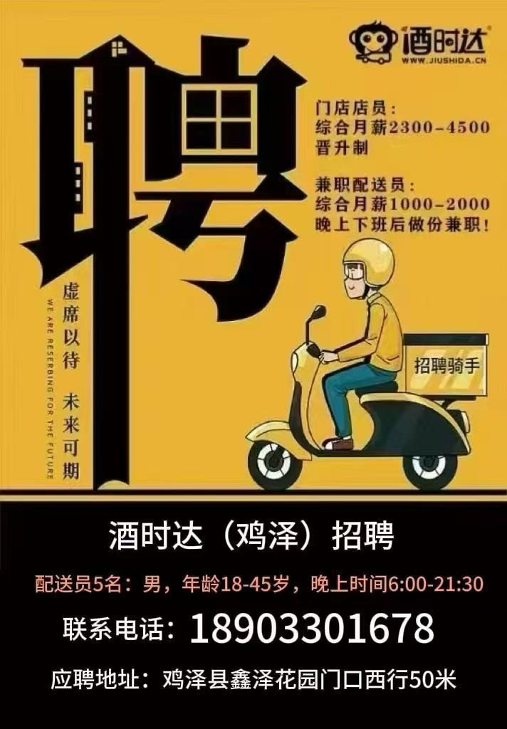 酒时达招聘兼职配送员,工作时间18:00—21:00,要求20–40岁,对县城熟悉,责任心强,长期工优先。 电话: 地址:鸡泽县九鼎东路139号