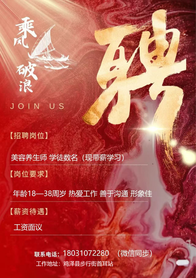 【急招!带薪学艺!】美容师/学徒0基础带薪学!师傅手把手教薪资+高额奖金(面议,诚意满满)弹性工时·快乐团队·快速晋升,要求:18-38岁,肯学肯拼,善于沟通,只招长期伙伴,短期勿扰!名额有限,手慢无!速联:(微信同号)一起搞事业,赚钱变美两不误! 工作地址:绿辰万国汇商业步行街