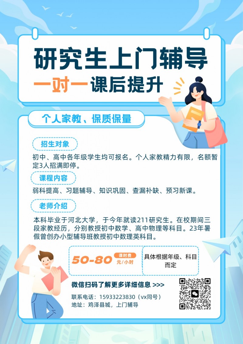 初高中数理化皆可胜任,免费试课,鸡泽县城的家长们可以看看。