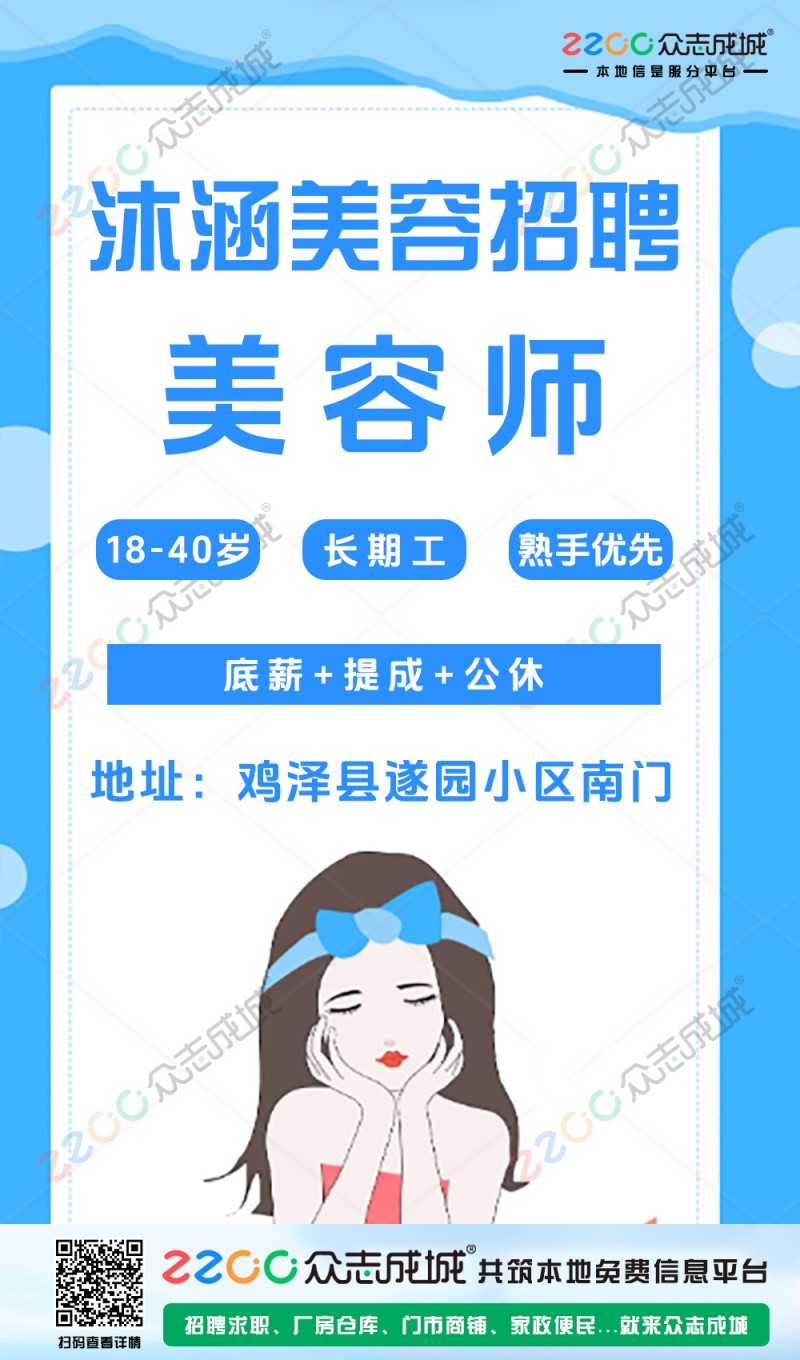 沐涵美容招聘:美容师,美容学员,要求:年龄:18-35岁,熟手优先,只招长期,短期勿扰,待遇:底薪➕提成➕手工,地址:鸡泽县遂园小区南门