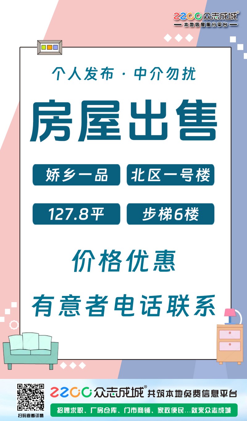 本人出售娇乡一品北区一号楼127.8平,步梯6楼价格优惠,有意者电话联系