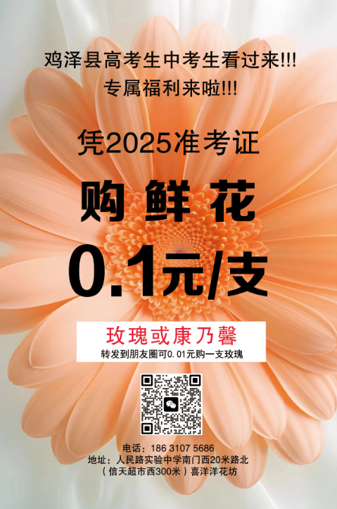 凭高考准考证享0.1元一支玫瑰或康乃馨,转发到朋友圈可0.01元购玫瑰。 电话 地址:人民路实验中学南门西20米路北(信天超市西300米)喜洋洋花坊