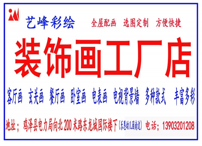 艺峰彩绘装饰画店重装展示,六月钜惠,回馈顾客,选图定制,方便快捷,欢迎来店选购,地址:龙城国际楼下,乐恩幼儿园南边,微信同步