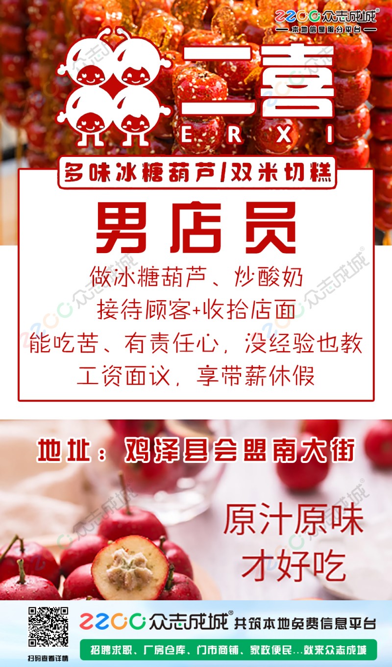 工作内容:穿糖葫芦半成品、接待顾客、介绍糖葫芦口味、收银打包、维护店内卫生,2700元/月,地址:鸡泽县会盟南大街258号