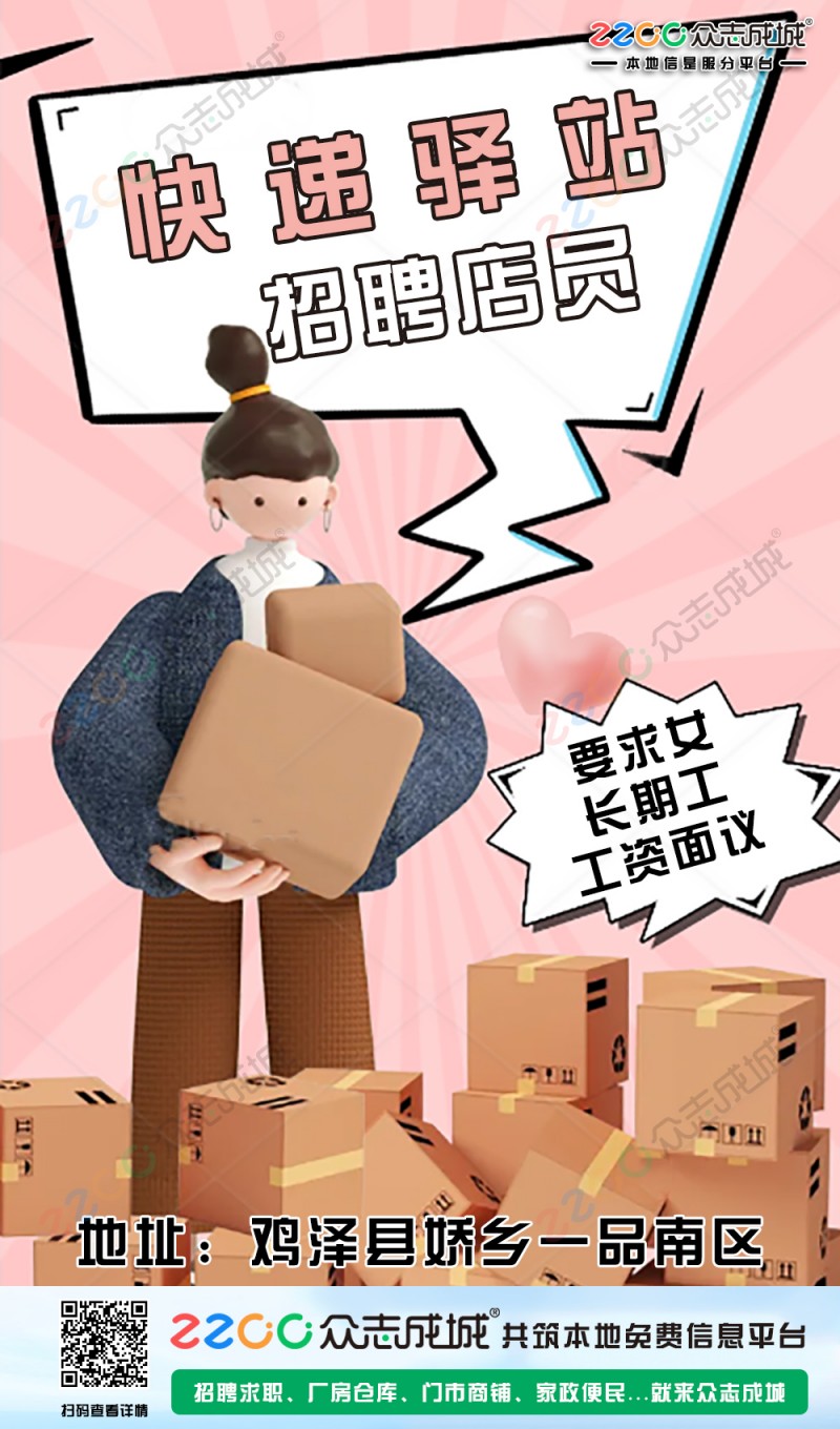 快递驿站招聘:店员一名,要求女,长期工,工作认真负责,县城附近,工资面议