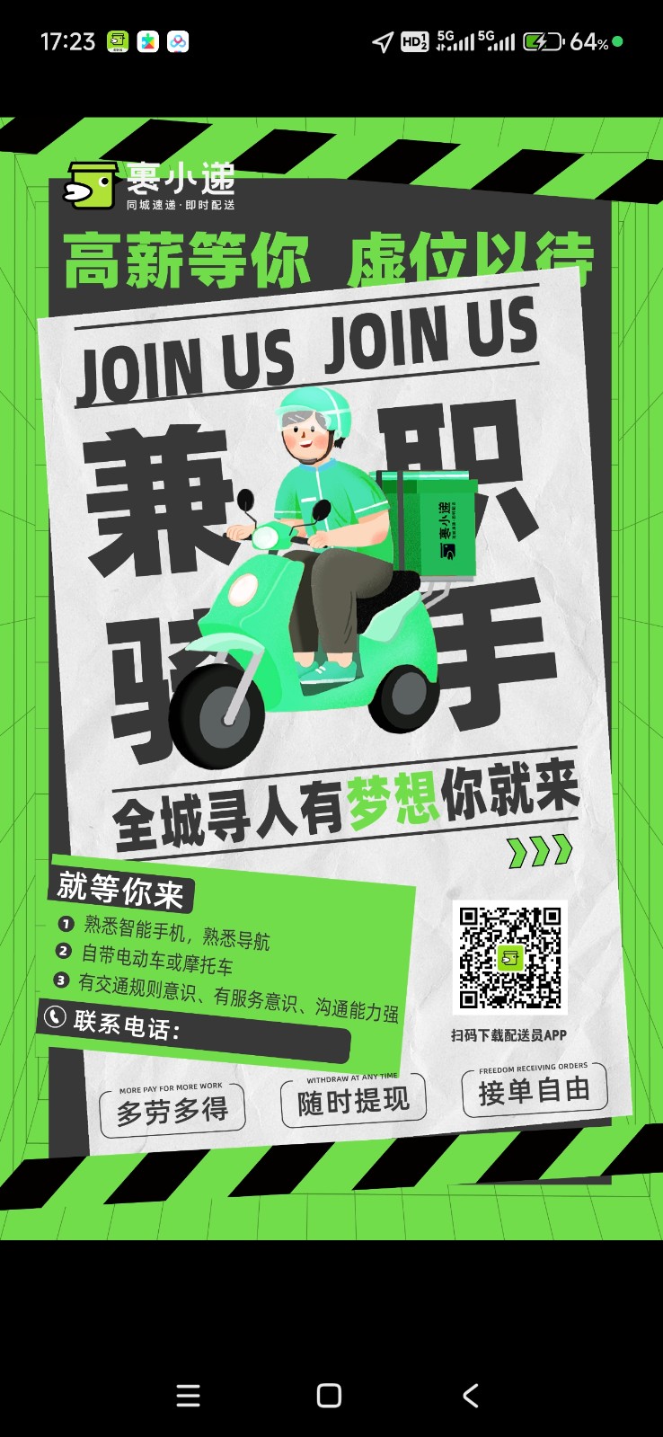 鸡泽县裹小递招聘骑手年龄18-45周岁,身体健康,无犯罪记录。会骑电动车,熟练使用智能手机导航。自备电动车、智能手机及充电宝。经验与能力无经验者可培训上岗,但需有强烈赚钱欲望和吃苦耐劳精神。学历不限,更看重服务态度和执行力。工作时间与地点工作时间灵活,可全职或兼职,根据订单需求排班。配送范围为鸡泽县内,需熟悉当地路线(软件自带导航辅助)。按单计费,多劳多得,每单平均3元站点电话