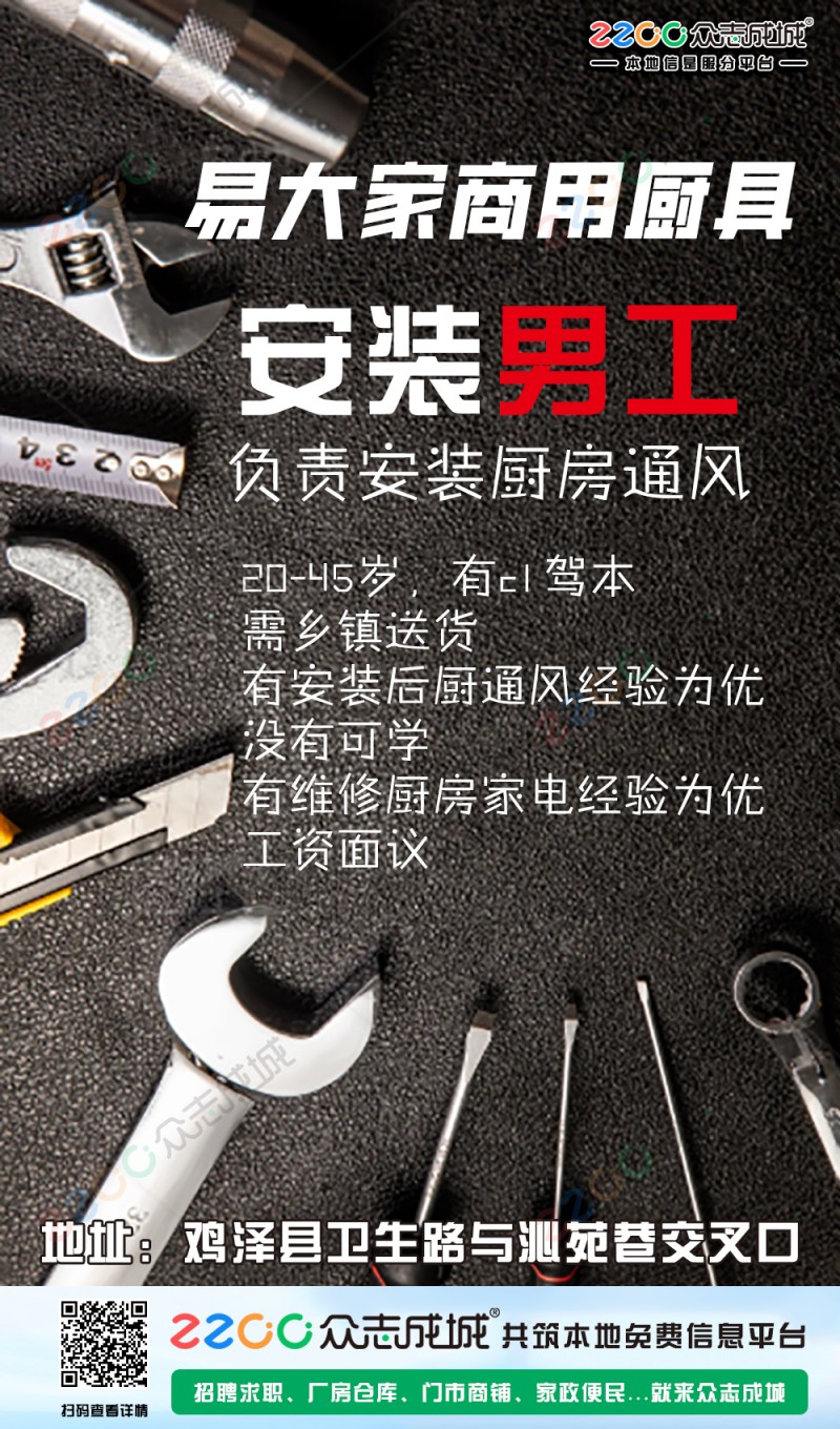 家家乐厨具招聘1.销售员,要求女,25-35岁,有销售经验优先地址:鸡泽县青年街