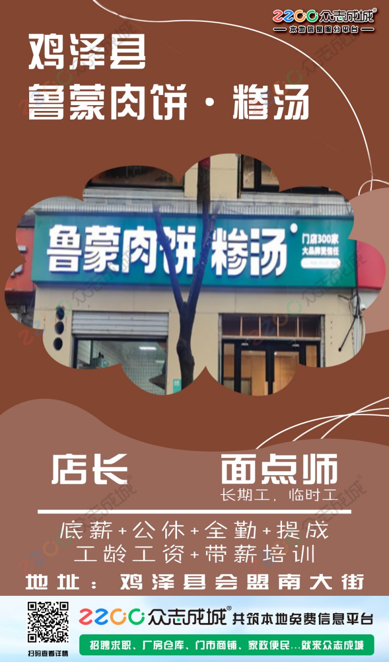 鸡泽县鲁蒙肉饼·糁汤招聘:店长1名,工资待遇:底薪公休全勤提成工龄工资带薪培训。