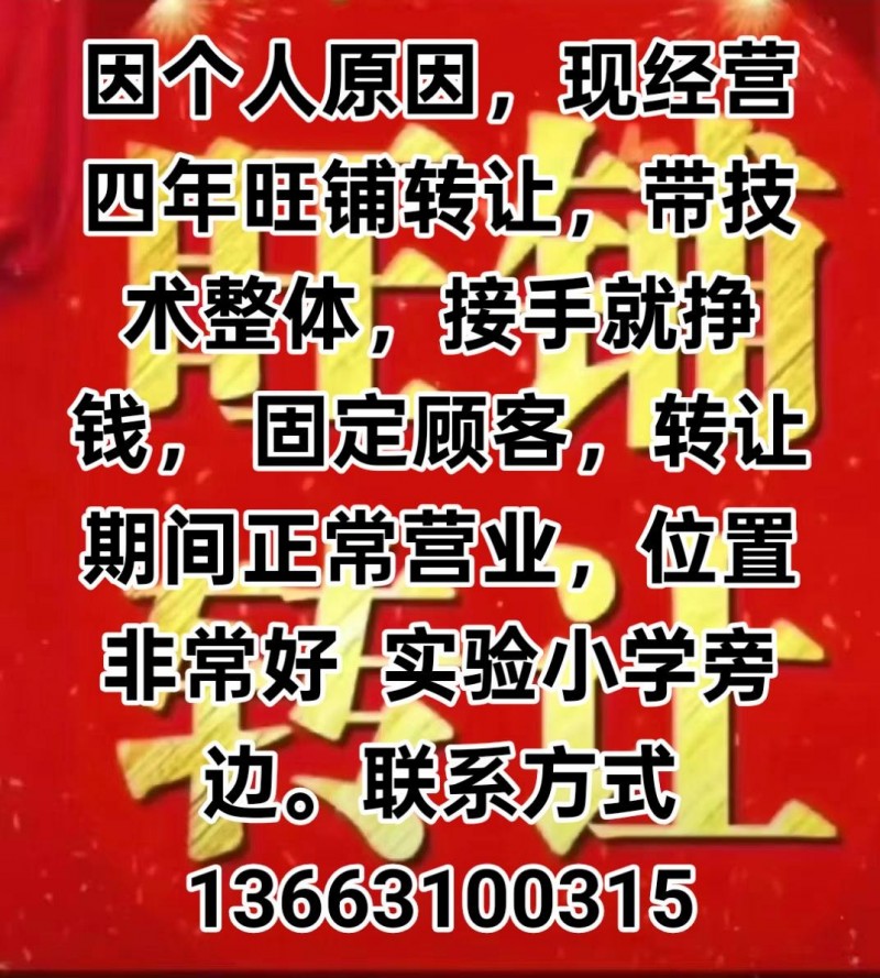 因个人原因,现经营四年旺铺转让,带技术整体,接手就挣钱,固定顾客,转让期间正常营业,位置非常好实验小学旁边。联系方式